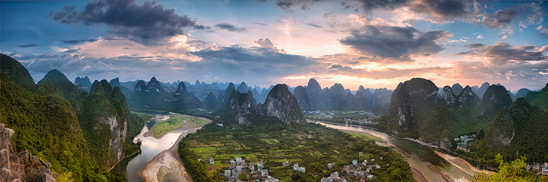 There are three main mountains in the Xinping area: Laozhai Hill, Xianggong Hill and Goupo Hill. Laozhai Hill is located at the back of Xingping Wharf. Taking the well-developed trail, one can hike to the top of the hill within 45 minutes. The hill top is an ideal location to take a panorama image of Li River at sunset, as shown in the following image taken by photographer Jay Daley.