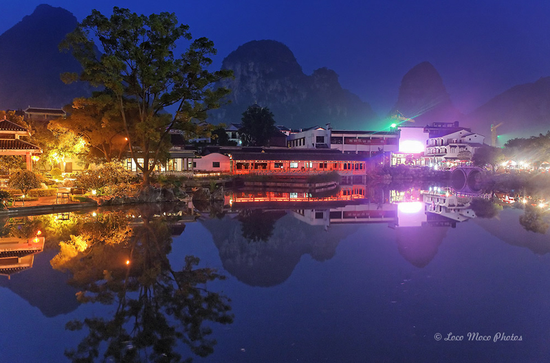 Huangbu is another beautiful location on Li River. Traveltime to get there is about 40 50 minutes by boat from Xingping Wharf. Typically, it is a location for morning shooting, especially on a calm day, as the reflections of the nearby mountain peaks will be perfectly illuminated in the right morning light. However, exceptions always exist. I took the following Huangbu Reflection image on a rainy evening.
