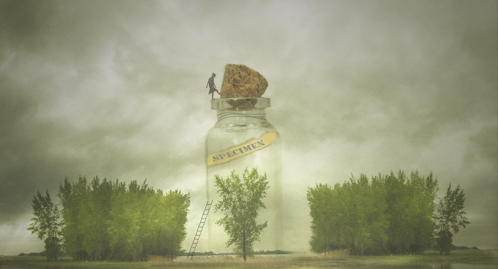 Fresh bushes, threatening clouds, a figure that closes a glass case, where the last tree will be preserved as a museum piece. It is a fantasy world with a clear and very timely message, in an era of increased awareness of environmental pollution and climate change.