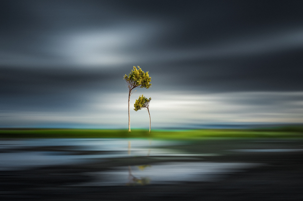 In his photograph "Family" José Antonio Sánchez attempts to wrap his surreal message into the aesthetic of the Romantics. The dark, threatening clouds, the reflection of the trees in the water, the play with the light, are all elements of the Romantic era.. The photo gets its surreal touch by its message and its supernatural reality. The landscape becomes a dreamscape with two trees on a green meadow lost between water and clouds, possibly the sole survivors of a flood or other catastrophy. They have no eye for their problematic environment. Life goes on as it is - big brother rebuking the little one. And so, in a surrealist or Dadaist way, an inherently tragic situation is made lighter by a delightful, possibly even ironic sense of humor.