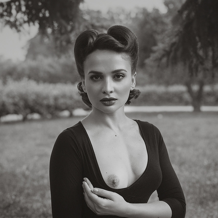 Another work among our favorites is a lady in a fountain with a teapot in her hands – ‘Secret Garden’. Sensual bodylines of a woman in a contrast morning light, also a black and white image. It was late March and the snow was still around. Cold air and dazzling light. As we used to work on open-air locations most of the time, there are always some passers-by or just curious people. Despite all these, the model conveyed necessary expression and emotion under our direction of the scene.