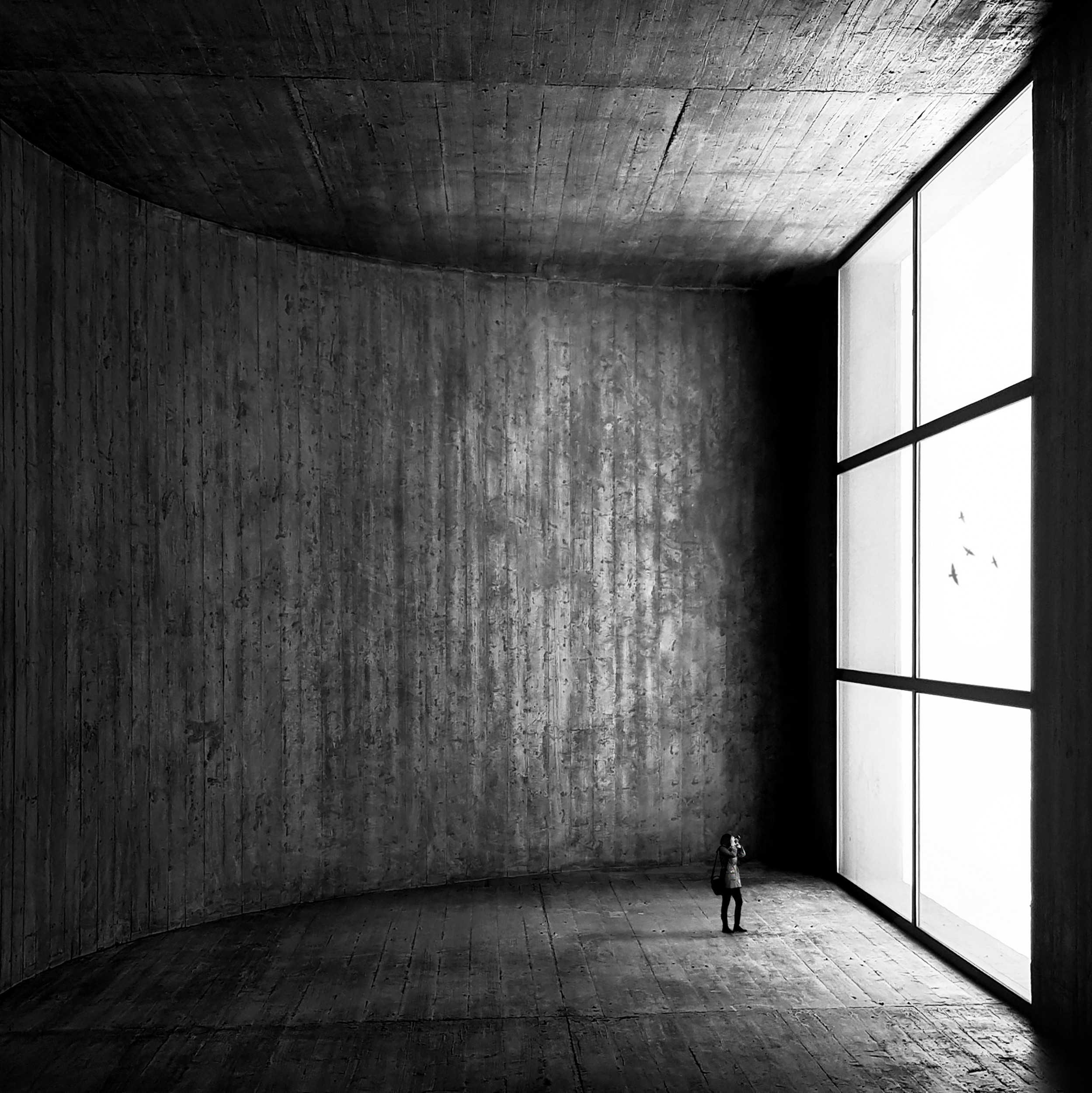 Here, Sara has done all of that. She has composed the image with particular skill and attention to detail as well as perfectly photographing the structure correctly. Simple and true, nothing distorted and everything correctly aligined. Adding a human element gives scale and power, true, but that human is not there for simply scale. No, this human is not passive, but unimpressed, more focused on photographing a passing flock of birds outside the huge window. That transforms this architectural image into more of a pictorial form of poetry. It askes questions. Make of it what you will. It all translates this brutalist concrete structure of a building into something more than simply utalitarian. It's more than a picture of a building. It's for the birds. Or the poets.