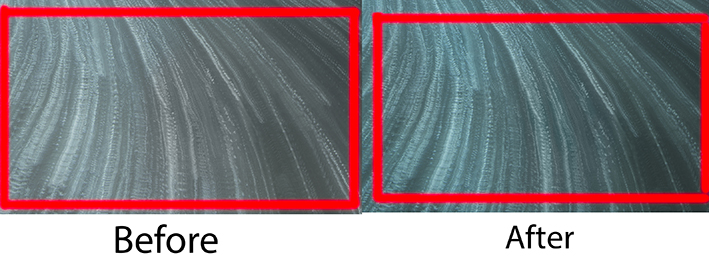 By enlarging 400% of the areas of the front boxes of these two shots, we can see that the right screenshot from the second shot was sharper than the left screenshot from the first shot.
