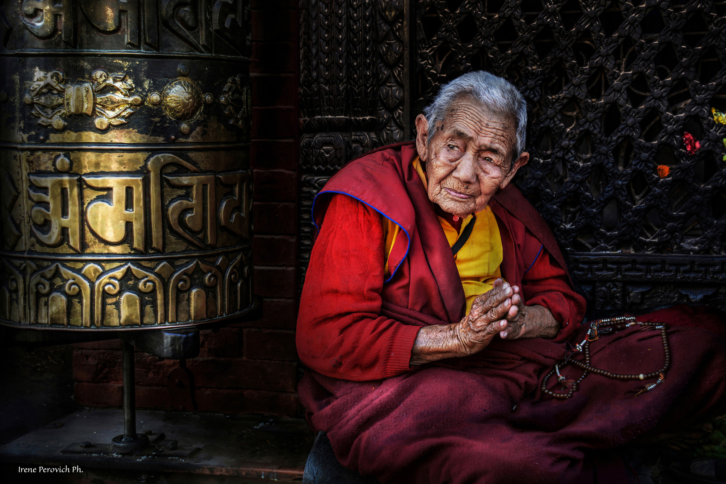 This little woman is almost an institution for the people of Kathmandu and also for the photographers and tourists to visit this pelgrimage. She is always and invariably there, immersed in prayers, in front of the Stupa's entrance. It is one of the largest and most significant Buddhist monuments in the world.