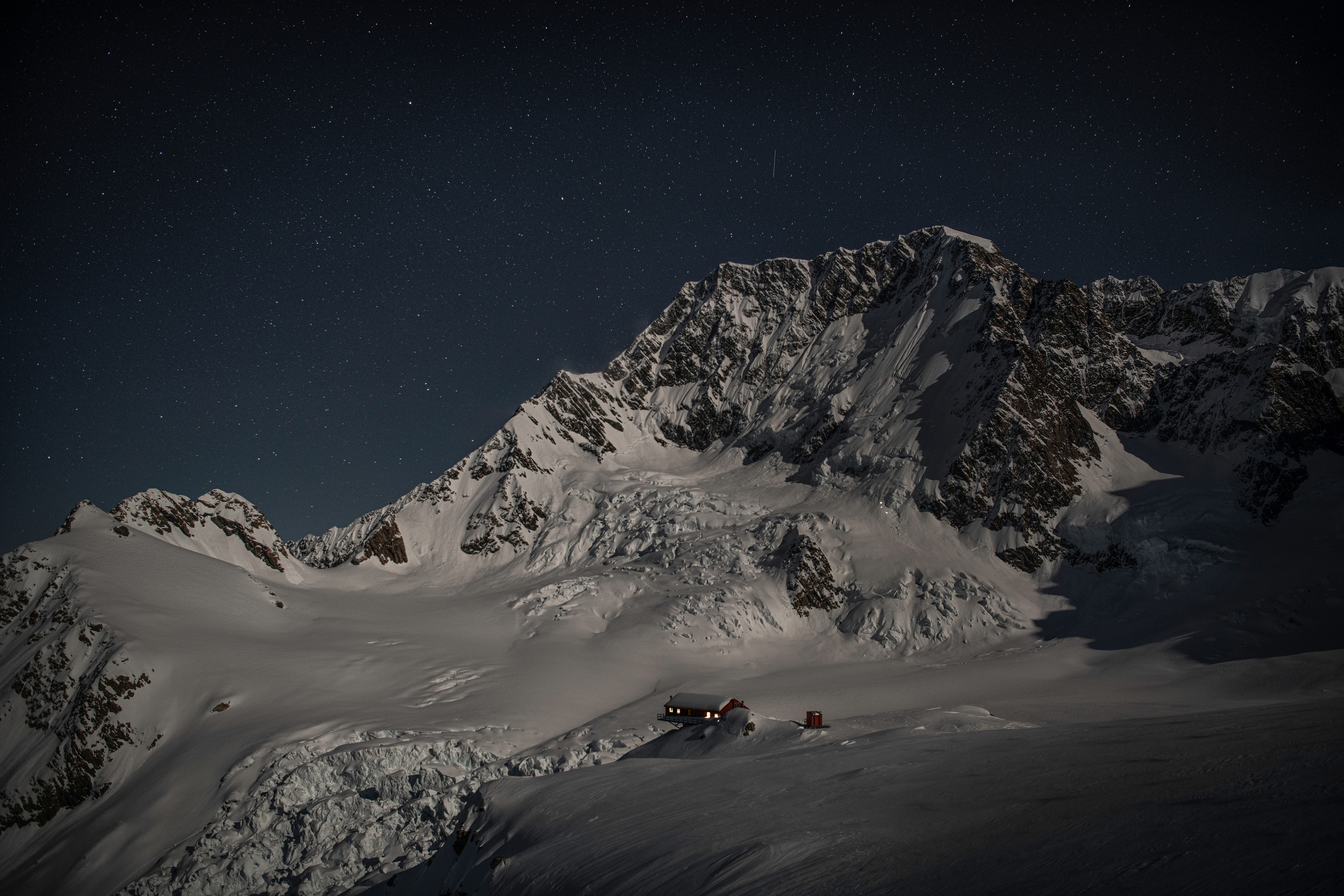 Surprisingly, on the second day into our trip, three men arrived at Plateau Hut. As luck would have it, they planned to climb Mount Cook through the Linda Glacier route. I knew this was my chance.  The three mountaineers set off at 1am on 16 September. From the hut, I could see three tiny headlights moving up the glacier in the darkness towards the giant wall of the Linda Glacier.