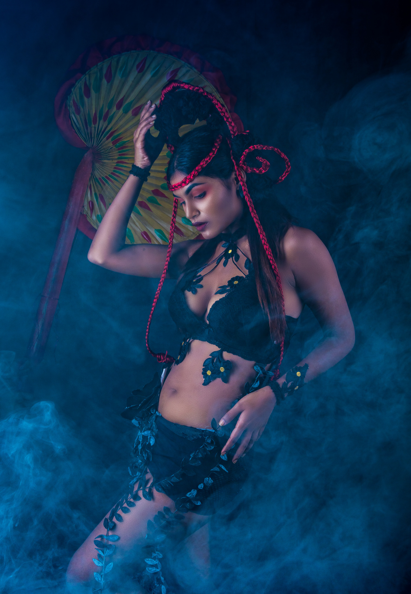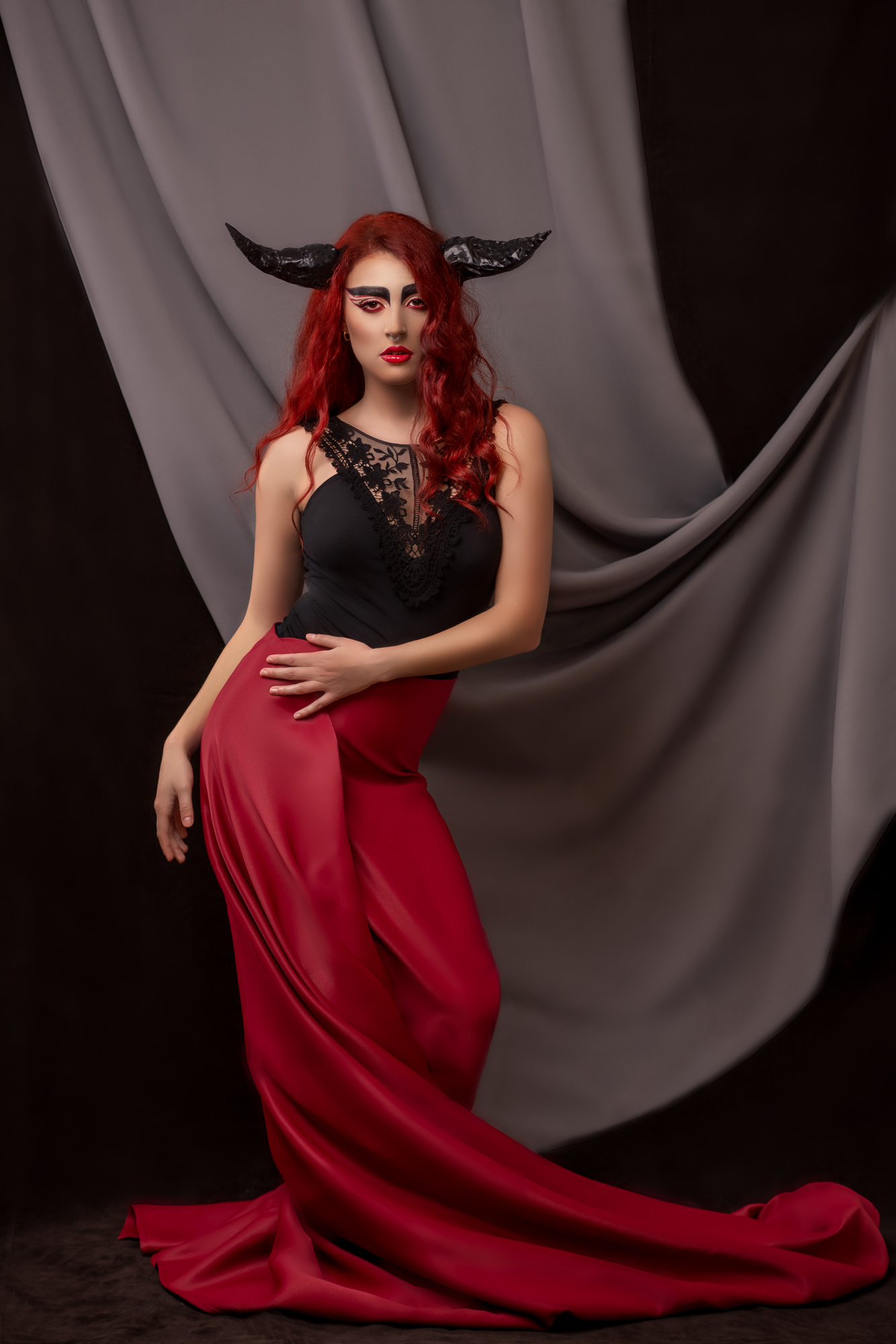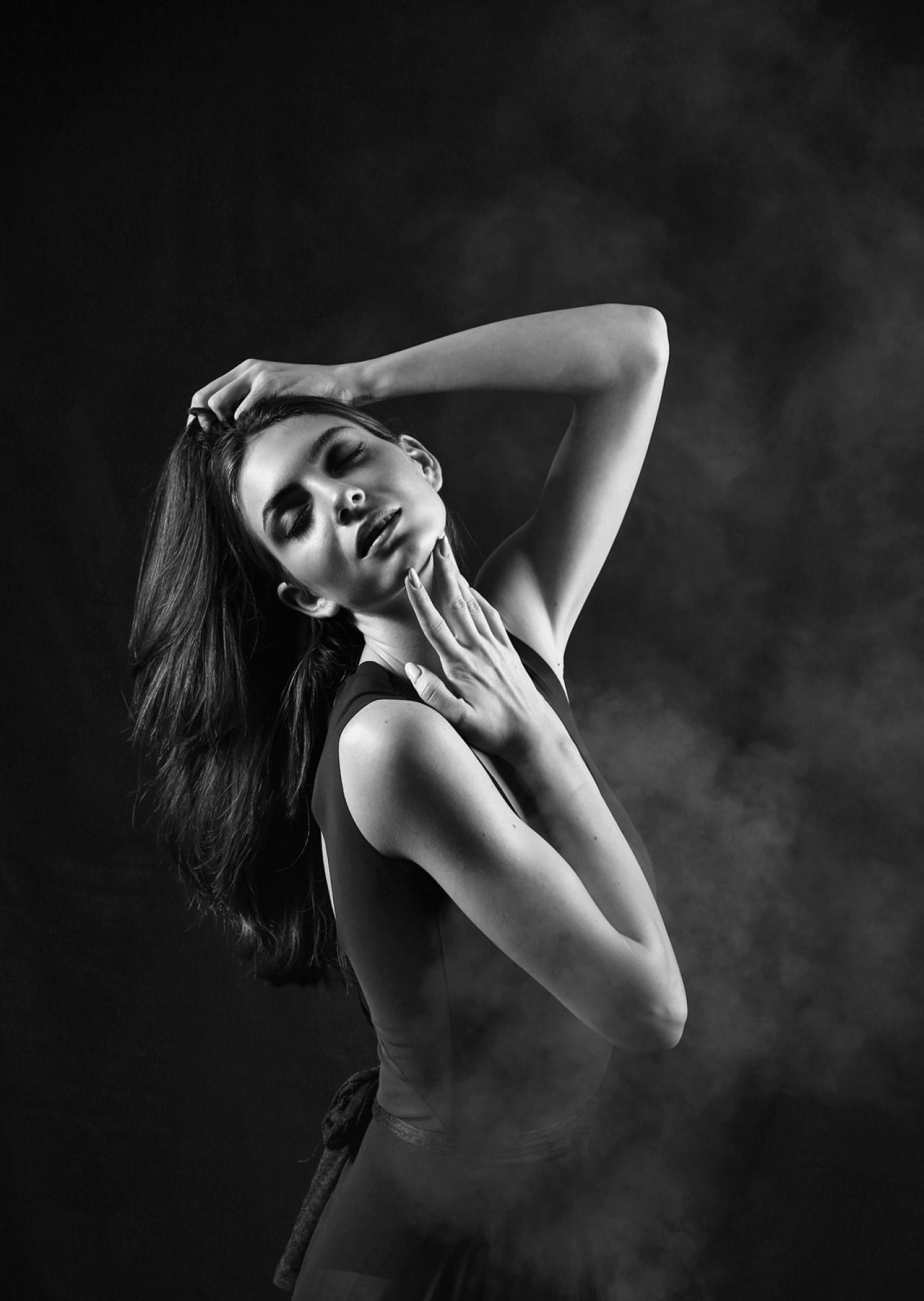 The subject’s arms are also important in maintaining the overall S-curve or hourglass shape.  For example, if the arms are facing downwards, it is important that the elbows are slightly bent so that there is a gap between them and the waist, else the shaping effect is lost. Symmetrical shaping of the arms (as in both hands on hips or above the head) is often effective but, taking the concept of contrapposto  a little further, posing the arms asymmetrically (one hand on the hip, the other stroking the hair) can give a wonderful sense of visual balance, movement, sensuality or drama, as in Michaelangelo’s David.