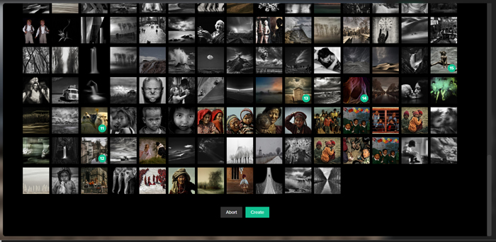Name your new exhibition and then click "Select photos". Select all photos you want to include in the exhibition. Numbers will indicate how many photos are selected. When you are done click "Create".