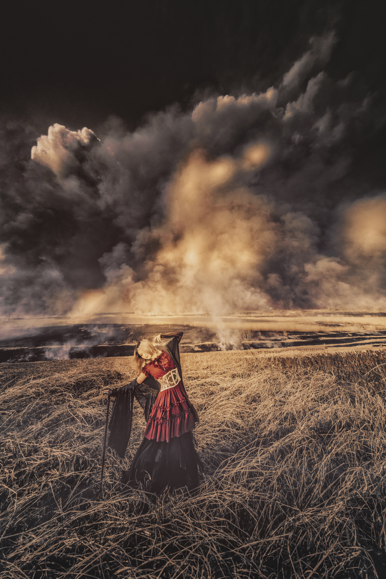 Before the shoot, I thought I was going to take a photo of a witch using magic. However, due to the direction of the wind and the rain the day before, the burning was poor and there was a lot of smoke. After a few shots, in this dramatic, story-like world, the model deviated from her original setting as a witch using magic, and in my eyes, she appeared to be playing a melody. And it seemed to be changing movements according to the winds of grief, craving, and smoke.
