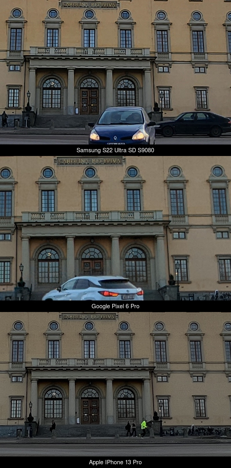 Here it is clear that the Pixel 6 Pro cannot compete with the Samsung and Apple in terms of field of view, capturing a less wide image of the scene. Samsung has the best dynamic range and handles the bright sun to the right of the building without problems. iPhone has a slight green cast, Pixel a slight red cast and Samsung is most neutral in terms of color and white balance.