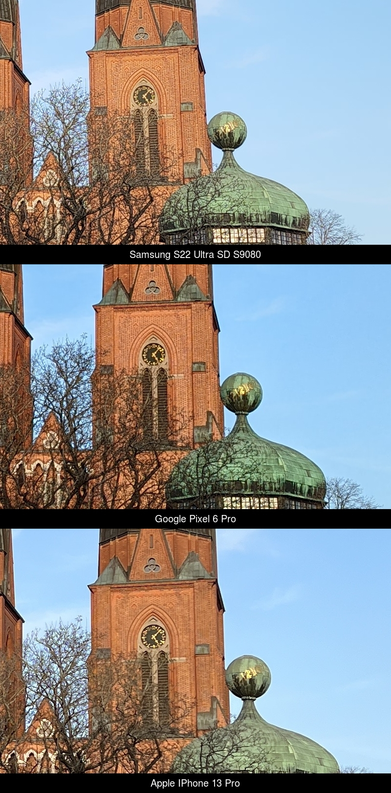 Next to the big cathedral is Helga Trefaldighet, one of the oldest churches in Uppsala built around the year 1290. The photos show different results from the previous example, with the Pixel producing the greater contrast between the sunlit and shadow part of the church wall. Pixel also has more details than the other two. iPhone again has more pop and saturation with great dynamic range of the sky. Worth noting is that the iPhone is a little oversharpened which is clearly visible on the tree branches in the upper left corner.